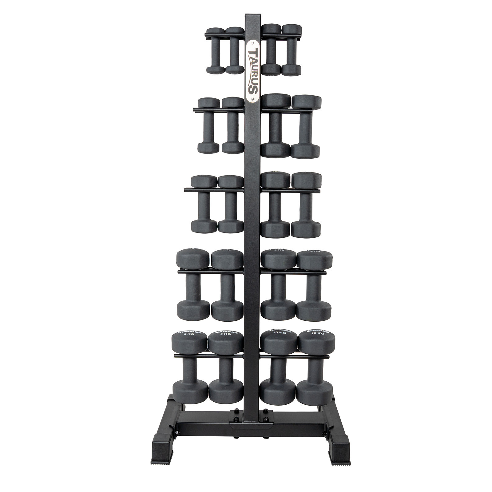 The Taurus Stand for Training Dumbbells provides a safe storage solution with a good overview of the dumbbells like the Taurus Neoprene Aerobics Studio Dumbbells, for example. The dumbbell stand hold up to ten pairs of dumbbells